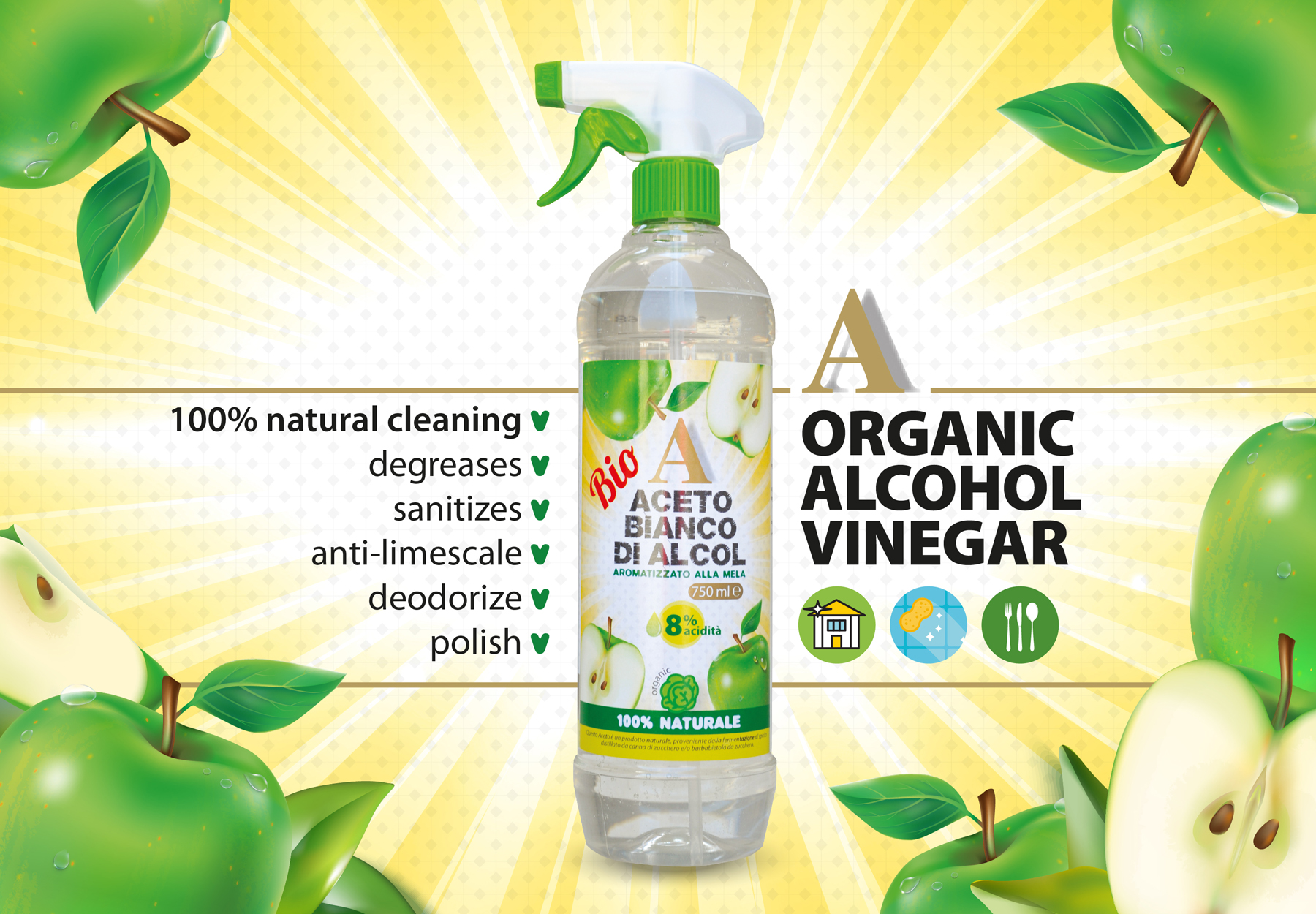 Apple Vinegar, Blood Orange Vinegar, Balsamic Vinegar of Modena IGP and the classics, Red and White Vinegar compose the full range of flavors to enrich your table.